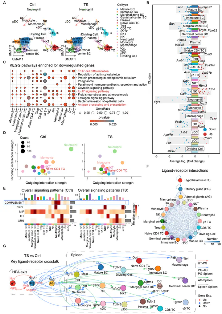 Transport stress (TS) significantly impacts immune function and infection, of which the cellular and molecular mechanisms remain elusive. In this study, we investigated the effects of TS on immune responses and its role in exacerbating Mycobacterium tuberculosis (Mtb) infection. TS induced anxiety-like behaviors, disrupted hypothalamic–pituitary–adrenal (HPA) axis homeostasis, altered hormone secretion patterns, and led to dysregulation of stress response genes in mice. Single-cell RNA sequencing of the spleen revealed severe immune dysfunction upon TS, characterized by inhibition of Th17 differentiation, IL-17 signaling, and antigen presentation. Importantly, TS affects the crosstalk between the HPA axis and the spleen through ligand–receptor interactions. Furthermore, TS exacerbated the severity of Mtb infection and disturbed infection-induced gene regulation. TS impairs Th1/Th2 differentiation through neuroendocrine immune dysregulation, and also compromises macrophage immune function, further weakening host defense. These findings could greatly contribute to understanding TS-induced neuroendocrine immune regulation and deteriorated infection.